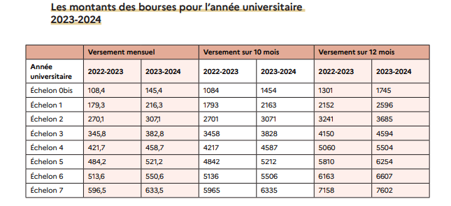 En complément de la révision des barèmes d’éligibilité, le gouvernement va revaloriser les montants des bourses de 37€ pour tous les échelons. Cela correspond à une augmentation de 34 € pour le 1er échelon et au niveau de l’inflation (7,3%) pour l’échelon le plus élevé.