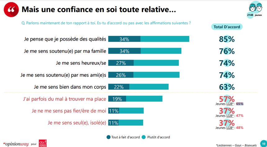 Si les contenus pour adultes influencent les relations intimes, on remarque également que la jeune génération partage une vision parfois toxique des relations amoureuses. Ainsi, pour 56 % des interrogés, c’est acceptable d’avoir les codes de téléphone de son ou de sa partenaire. Dans une même proportion, les jeunes considèrent la jalousie comme une preuve d’amour, et 25 % ne voient aucun inconvénient à fouiller dans le téléphone de son compagnon. Il ressort de ce sondage, qu’une relation épanouie doit se baser sur ces trois piliers : "Avoir confiance l’un en l’autre", "s'aider dans les moments difficiles" et "avoir une bonne communication". Si une majorité écrasante s’accorde sur l'importance 'avoir confiance en soi pour établir une relation de couple durable, 57 % affirment avoir du mal à se trouver une place dans la société, et 37 % n’éprouvent pas de fierté envers eux-mêmes. Des pourcentages qui grimpent du côté des personnes LGB (Lesbiennes-Gays-Bisexuels). Ces problèmes de confiance en soi engendrent des "situations de violence avérée" selon Opinionway. Dans l'échantillon, 21 % des femmes ont déjà vécu des situations de harcèlement sexuel et 9 % ont subi un viol ou ont été confrontées à la porno divulgation. Si 5 % des hommes hétérosexuels ont déjà été agressés, lorsque ces messieurs font partie de la communauté LGB, les faits d’agressions (25 %) et de discrimination (36 %) s'envolent. Pour 57 % de tout le panel, il n’y a eu aucun soutien ni de l'entourage ni de l'établissement scolaire. Pourtant, le personnel est chargé d’accompagner les élèves en souffrance en cas de harcèlement ou d’agression. De nombreuses organisations et associations peuvent également accompagner les victimes telles que le Planning familial ou En Avant toutes. Et aux vues des nombreuses affaires récentes de harcèlement relevées dans les établissements, il y a urgence à faire appliquer la loi. L’enseignement sexuel ne peut être facultatif, c’est bien l’enseignement de ce sondage.