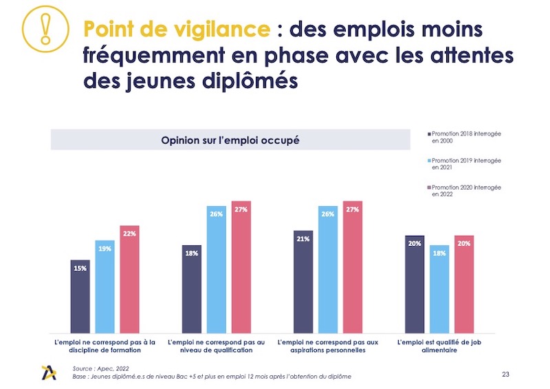 Reste que le salaire médian des bac 5 et plus plafonne à 30?000 euros brut, soit une baisse de 6 % en deux ans. Sans compter, une iniquité notable entre les sexes avec un salaire médian à l’entrée de 27?600 euros pour les femmes, soit 5?400 euros de moins que pour leurs confrères. Autre signe inquiétant, environ un jeune sur quatre accepte un emploi par défaut. Pas en phase avec la discipline de sa formation, ou ne correspondant pas à son niveau de qualification ou à ses aspirations personnelles. Pire, pour 20 % d’entre eux, leur emploi n’est rien d’autre qu’un job alimentaire.