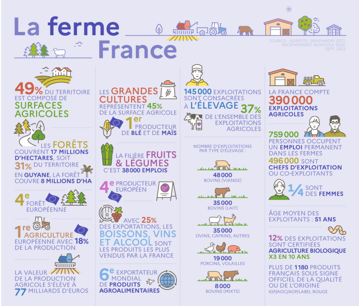 Avec 49% de son territoire composé de terres agricoles, la ferme France en impose. Véritable grenier de l’Europe, la France est la première agriculture européenne avec 18% de la production. Premier pays européen producteur de blé et de maïs, la France occupe aussi la 4e place pour la production de fruits et légumes. L’élevage français n’est pas en reste non plus, puisque la France est le 1er pays producteur européen de viande bovine et le 3e pays producteur européen de porcs et de volailles.