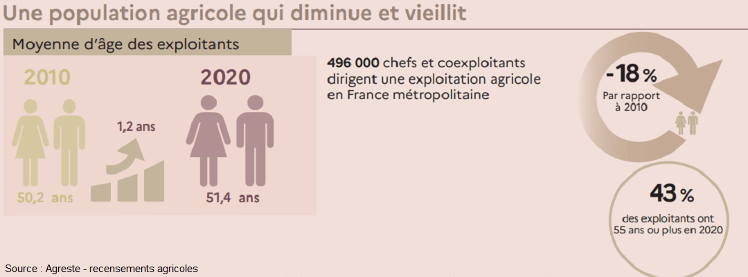 Moins nombreux, les agriculteurs sont aussi plus âgés. En 2020, la moyenne d’âge des exploitants était de 51,4 ans contre 50,2 en 2010.