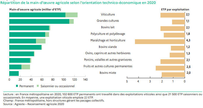Selon le dernier recensement agricole, 759 000 personnes (soit l’équivalent de 583 100 équivalents temps plein ou ETP) travaillent sur les exploitations agricoles en France métropolitaine soit 208 000 personnes de moins qu’en 2010. A l’origine de cette baisse, la diminution du nombre d’exploitations et notamment des exploitations individuelles (- 100 000 en 10 ans) gérées par des chefs d'exploitation (et éventuellement des co-exploitants) et des membres de leur famille. Si l’on y ajoute la main-d’œuvre saisonnière ou occasionnelle (75 600 ETP), le volume de travail total (659 500 ETP) a diminué de 10,8% en 10 ans.