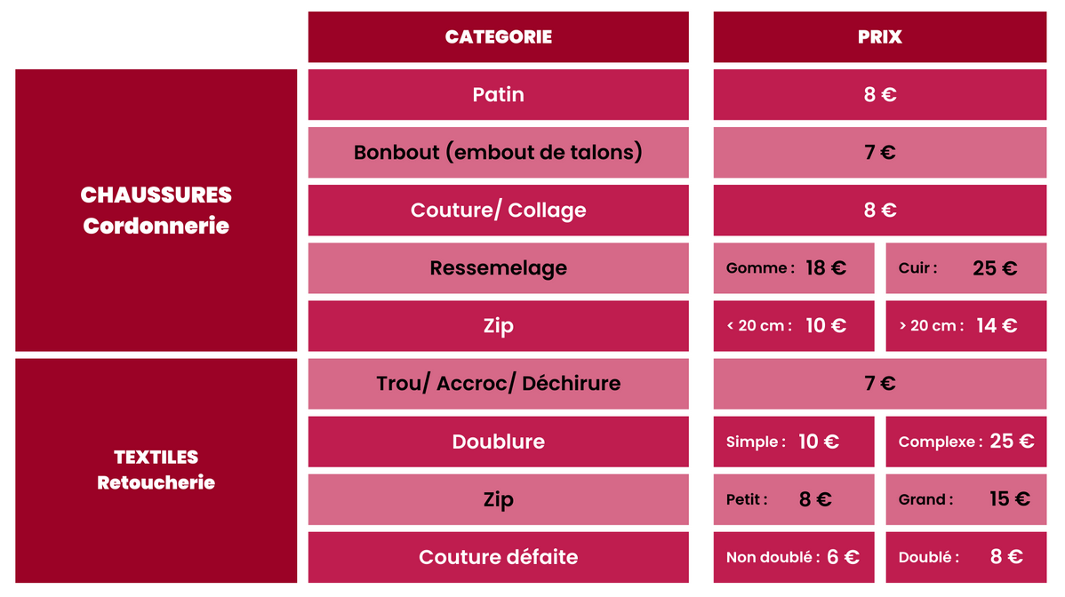 Une grille tarifaire précise le montant attribué pour chaque catégorie de produits. Par exemple, la réparation d’un vêtement troué, déchiré ou présentant un accroc permet d’obtenir un bonus de 7 euros. Il sera possible de cumuler plusieurs bonus pour plusieurs réparations sur un même vêtement, toujours dans la limite de 60 % du montant global de la facture.