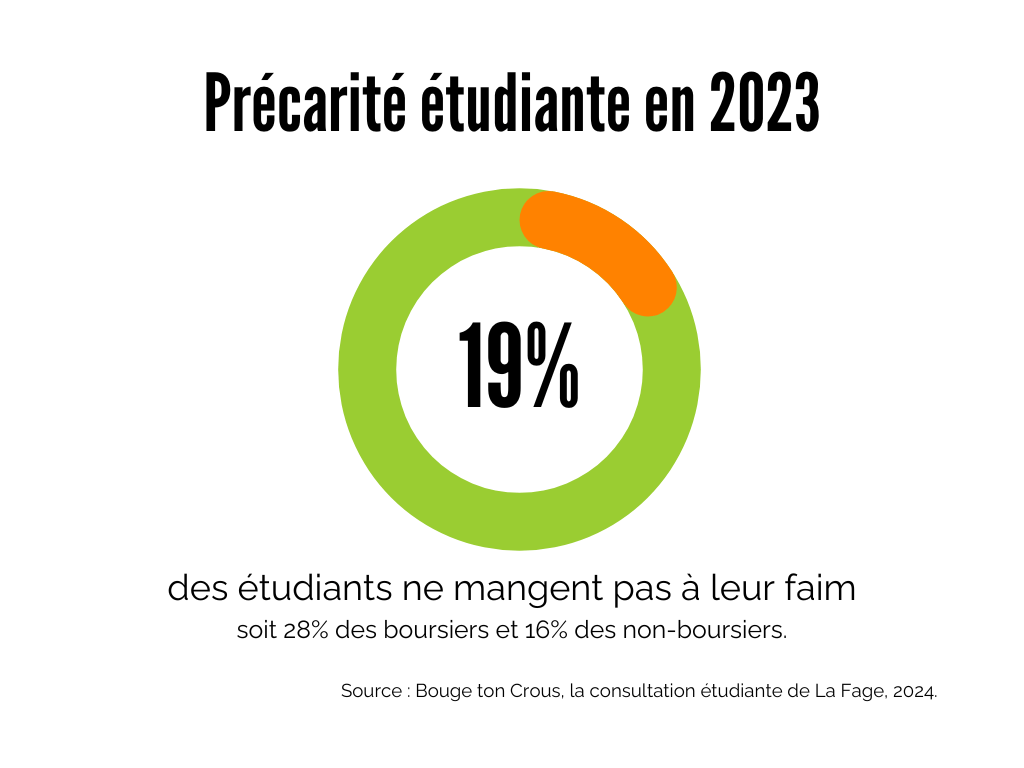 La Fédération des associations générales des étudiants (Fage) tire la sonnette d’alarme pour la 22ème année consécutive. En 2002 déjà, la plus grande association universitaire publiait son premier indicateur du coût de la vie étudiante. Dans cette nouvelle étude « Bouge ton Crous », rendue publique le 10 janvier 2024, 7 500 étudiants ont été interrogés sur leurs conditions de vie. Il en ressort notamment que 19% d’entre eux ne mangent pas à leur faim : ils sauteraient plus de trois repas par semaine. Et c’est pire pour les boursiers avec 28% d’étudiants insuffisamment alimentés (contre 16 % des non-boursiers).