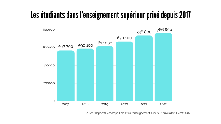 Depuis une décennie, l’enseignement supérieur privé voit ses effectifs croître jusqu’à concentrer 26 % des étudiants aujourd’hui. Candidatures rejetées, manque de places dans le public, essor de l’apprentissage avec les aides de l’État, autant de raison qui poussent à opter pour le privé. Pourtant, le secteur privé à but lucratif se trouve régulièrement épinglé pour opacité et dérives. Si vous voulez en savoir plus, lisez nos articles ici et .