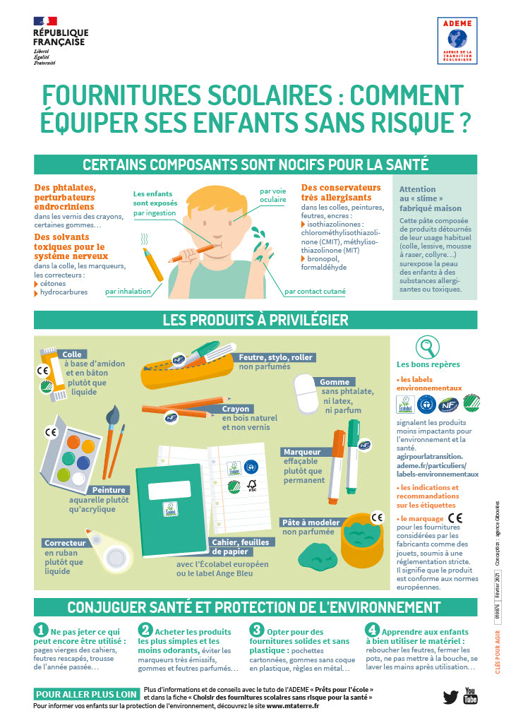 L’Ademe (l’agence de l'environnement et de la maîtrise de l'Énergie) propose, quant à elle, une affiche récapitulative pour choisir des fournitures scolaires sans risque pour la santé.