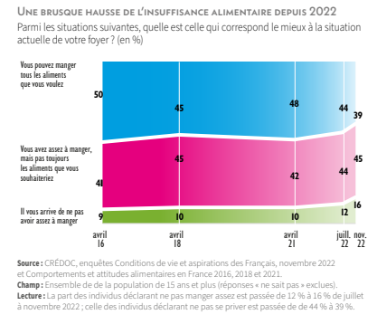 Alors que la précarité alimentaire n’avait augmenté que de 3 points entre 2016 et juillet 2022, elle a bondi de 5 points en seulement 5 mois passant de 12% à 16% entre juillet et novembre 2022. Fin novembre 2022, 16% des Français avouaient ne pas manger à leur faim.