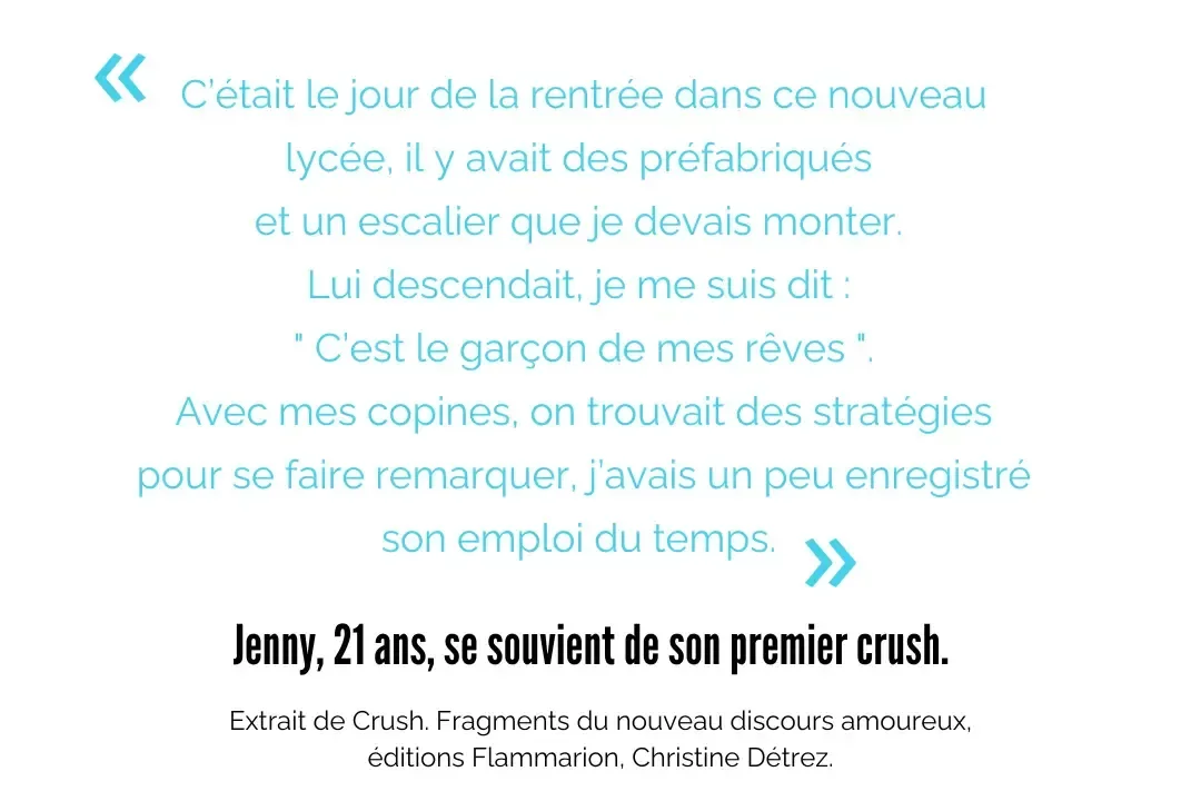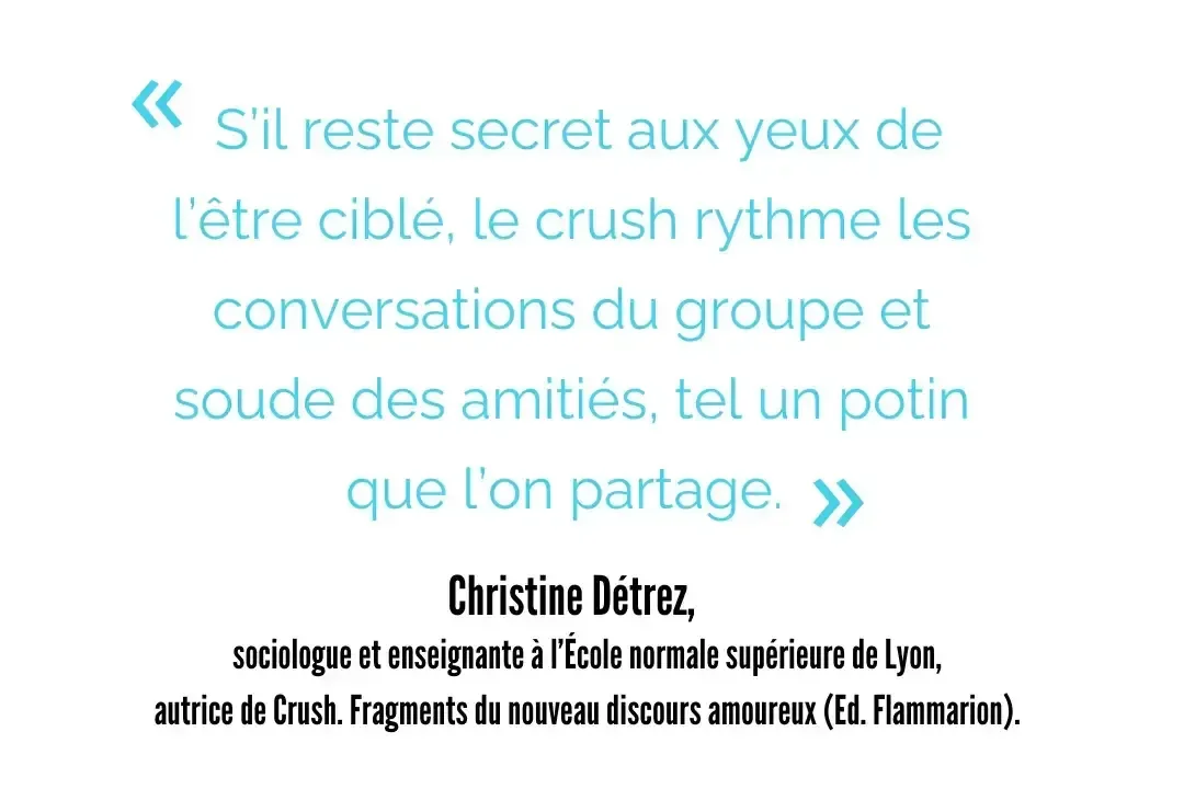 - Dans son ouvrage Crush (éd. Flammarion), la sociologue Christine Détrez étudie comment le terme « crush » a envahi les collèges et lycées cette dernière décennie.