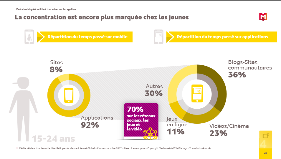 Les applications mobiles connaissent un essor considérable. Les jeunes y consacrent 92% de leur temps et tout particulièrement les applications des réseaux sociaux, des jeux et des plateformes vidéos. « Les 10 applications les plus consultées appartiennent toutes à Facebook, Google et Apple » explique Bertrand Krug, Directeur du Département Internet de Médiamétrie. Alors vous vous sentez prêt à passer cette journée sans Facebook ? Un peu trop facile non ? Si pour corser un peu le challenge, on passait la journée sans Facebook, sans Messenger, sans Instagram et sans WhatsApp, qui appartiennent tous… à Facebook !