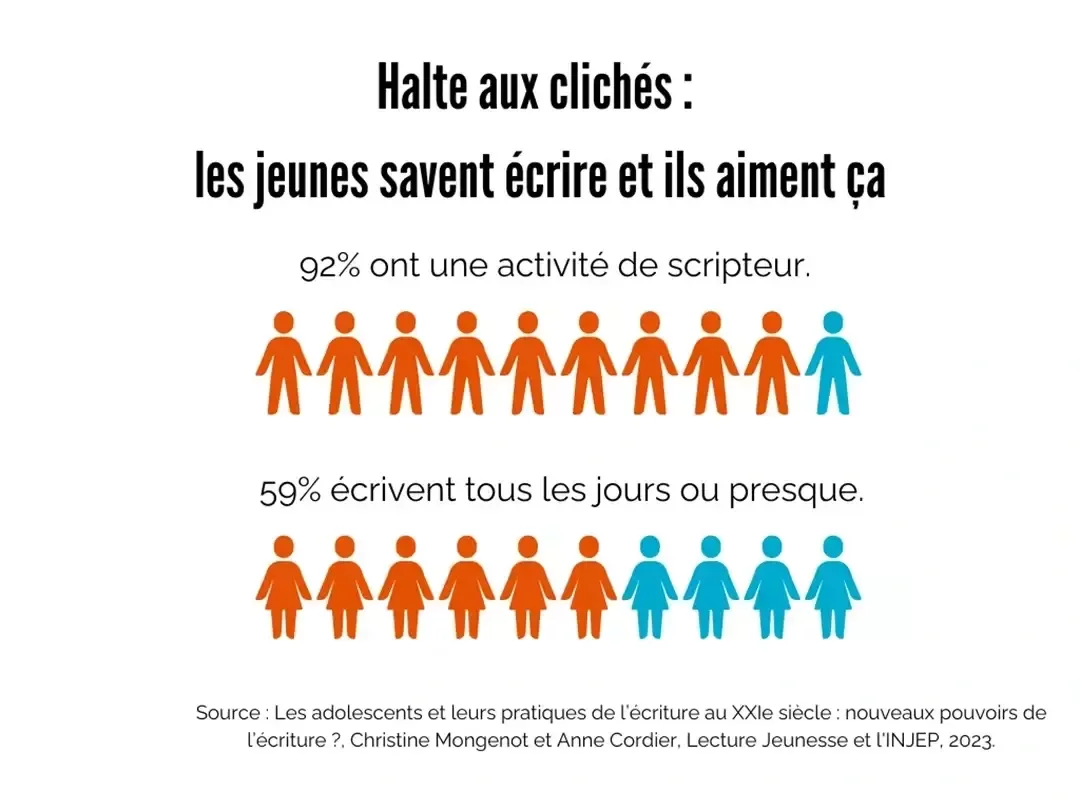 « On n’est pas sérieux, quand on a 17 ans […] Vous êtes amoureux. ? […] Puis l’adorée, un soir, a daigné vous écrire… ! ? Ce soir-là,… ? vous rentrez aux cafés éclatants, Vous demandez des bocks ou de la limonade… ? On n’est pas sérieux, quand on a dix-sept ans. Et qu’on a des tilleuls verts sur la promenade. » Que reste-t-il de la poésie de Rimbaud ? Les jeunes de 2023 ne sont-ils pas sérieux ou ne sont-ils pas pris au sérieux ? Loin des clichés, les ados écrivent. Pas toujours en vers, mais parfois à la plume ! C’est le constat à tirer de la nouvelle enquête « Les adolescents et leurs pratiques de l’écriture au XXIe siècle : nouveaux pouvoirs de l’écriture ? », réalisée par l’association Lecture Jeunesse et l'Institut national de la jeunesse et de l'éducation populaire. Pour parvenir à cette conclusion, ont été compilées les réponses de 1 500 jeunes Français âgés de 14 à 18 ans, mais aussi les données issues d’une cinquantaine d’entretiens individuels. Et toutes les formes possibles d’écriture ont été analysées. Un chiffre en particulier sort du lot : « Au total, 92 % des jeunes ont une activité de scripteur déclarée ». Comprendre le « scripteur » par « l’émetteur » d’un message écrit. Parmi les jeunes interrogés, 59 % estiment écrire « tous les jours ou presque » : SMS, liste de course, fanfiction, post Instagram … Le rapport insiste sur le fait que : « les jeunes écrivant sur les réseaux sociaux rédigent plus que la moyenne » tous types d’écrits, de formats ou de supports considérés (13 %, pour les messages d’amour, 7 % pour les messages écrits à la main à des amis, 16 % pour les brouillons pour publications en ligne) ».