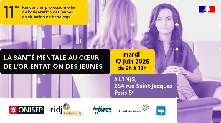 Quel rôle peuvent jouer les professionnels dans la santé mentale des jeunes en situation de handicap, afin de favoriser un parcours d’orientation épanoui ? La santé mentale est un « état de bien-être qui permet de réaliser son potentiel… » selon l’OMS. La 11e édition des Rencontres professionnelles de l’orientation des jeunes en situation de handicap analysera les ressorts de la construction de parcours et proposera des clés et des outils. Le CIDJ, l’Onisep et Droit au savoir réuniront des spécialistes mardi 17 juin 2025, de 9 h à 13 h, à l’INJS, 254 rue St Jacques, Paris 5e, autour de tables rondes. Gratuit sur inscription sur WEEZEVENT