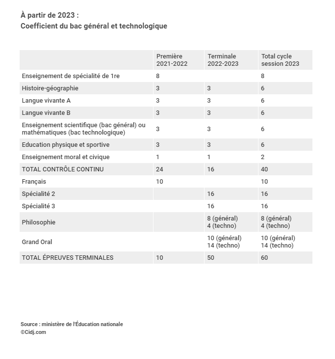 Concernant les épreuves finales, ce sont les enseignements de spécialité qui, avec un coefficient de 16 pour chacun d'eux, pèsent le plus dans la note, suivi du Grand oral, affecté d'un coefficient 10 en voie générale et 14 en voie technologique, des épreuves de français (coefficient 5 pour l'oral et coefficient 5 pour l'écrit) et de la philosophie (coefficient 8 en voie générale, 4 en voie technologique).
