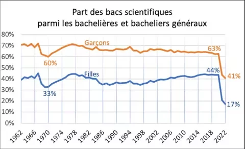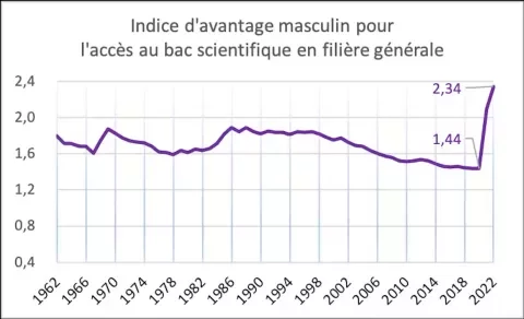 Si l’avantage a toujours été aux garçons, on constate un lent progrès vers l’égalité depuis 1986 et jusqu’en 2020. Après la réforme, en 2022, un garçon a 2,3 fois plus de chances qu’une fille d’avoir un bac « sciences », c’est l’inégalité la plus forte observée au cours de toute la Vᵉ République.