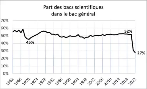 Le nombre d’élèves en formation scientifique est crucial au regard des compétences techniques et scientifiques nécessaires aux transitions environnementales, sociales et économiques du pays. La plupart des acteurs économiques font état de leurs difficultés à recruter et demandent d’augmenter rapidement le nombre de personnes formées à un niveau Bac 5 dans ces domaines. Analyser la situation actuelle nécessite de prendre en compte les profondes modifications du contexte scolaire de la Vᵉ République. Jusqu’au début des années 1960, le baccalauréat ne concerne qu’une petite partie de la population, surtout issue de la classe bourgeoise urbaine. Guidées par les différents plans de développement économique et social, les politiques éducatives d’alors vont ouvrir largement l’accès aux études secondaires et supérieures. La réforme Fouchet de 1965 du lycée général supprime la sélection pour entrer en terminale et créé de nouvelles séries, dans lesquelles les volumes horaires de sciences et de mathématiques augmentent. On assiste à partir de la fin des années 1960 à une massification rapide de l’accès au bac général : si celui-ci ne concerne que 11 % d’une classe d’âge en 1962, cette part s’élève à 18 % en 1975 et à près de 44 % en 2022.