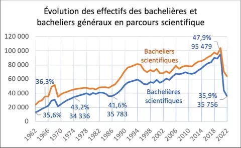 Le discours public met aujourd’hui l’accent sur la promotion des femmes dans les métiers scientifiques et techniques. Favoriser leur accès à ces voies prestigieuses est présenté comme un enjeu majeur, pour l’économie du pays comme pour l’égalité entre les femmes et les hommes. Dans ce contexte, les effets de la réforme du lycée instaurée en 2019 posent question. Celle-ci qui a mis fin au système des séries générales de baccalauréat (voie scientifique, voie littéraire, voie économique) offrant une plus grande latitude dans la composition des programmes de première et terminale, à partir d’un socle commun et d’enseignements de spécialité. Cependant, cette organisation modulaire s’est accompagnée d’une chute massive des inscriptions dans les disciplines scientifiques au lycée, qui touche particulièrement les filles. Alors que la place des femmes a été déclarée grande cause du quinquennat 2017-2022 et que les enjeux autour des sciences revêtent une dimension internationale, on observe en France un retournement d’ampleur inédite sur l’égalité d’accès aux sciences au lycée général, en contradiction avec les intentions affichées. C’est ce qui ressort quand on reconstruit les évolutions des effectifs des bacheliers et bachelières depuis 60 ans.
