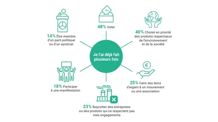 Selon l’Ademe, moins d’1 jeune de 15 à 25 ans sur 10 intègre une association de défense de l’environnement, alors que près de 80 % d’entre eux sont plus préoccupés par ces problèmes que leurs proches. Ce paradoxe est dû au fait que les jeunes générations se sentent engagées dès lors qu’elles ont conscience d’un problème ou qu’elles prennent parti : leur engagement ne passe pas forcément par le vote ou le bénévolat, contrairement à leurs aînés (12). Ce qui explique pourquoi 45 % des jeunes de 18 à 24 ans déclarent être engagés pour une cause écologique et la lutte contre le gaspillage alimentaire.