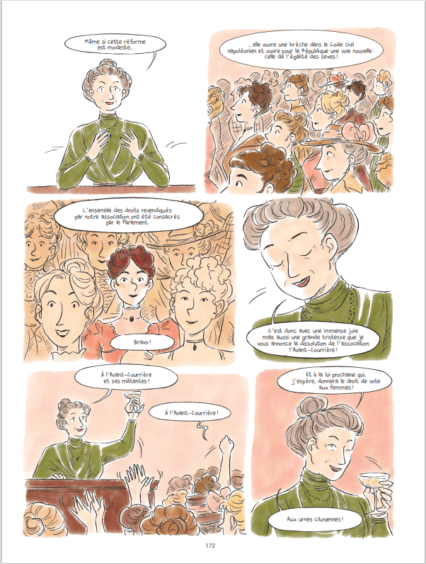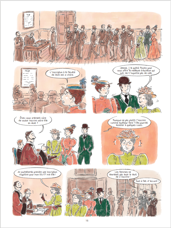 Jeanne Chauvin a ouvert une brèche. Sans que les prestations de serment ne se comptent par dizaines pour autant. En 1904, le barreau de Paris comprenait seulement quatre avocates. Rappelons que pour exercer elles devaient obtenir l’autorisation de leur mari. L’autorité maritale ne prend fin que dans les années 60. Entre-temps, les femmes accèdent à la magistrature en 1946. Dans la BD, on observe comment la carrière d’Émile, de huit ans son cadet, avance très vite quand Jeanne doit batailler de son inscription à la fac de droit, à la prestation de serment, en passant par la soutenance de sa thèse !