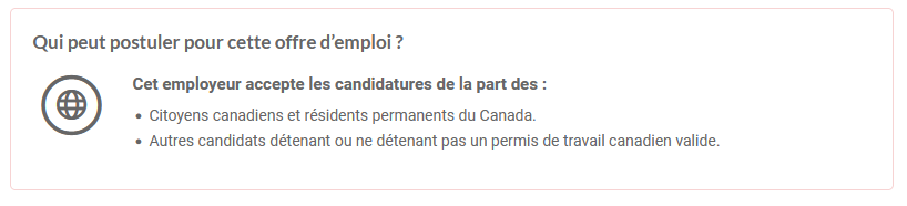 Si chaque offre publiée sur Guichet-Emplois peut être pourvue par un travailleur étranger, la réalité s’avère plus complexe. Le site rassemble des offres d’emplois émanant de jobboards canadiens ou directement déposées par les entreprises. Dans ce dernier cas, les annonces précisent clairement qui peut postuler, comme indiqué ci-après.
