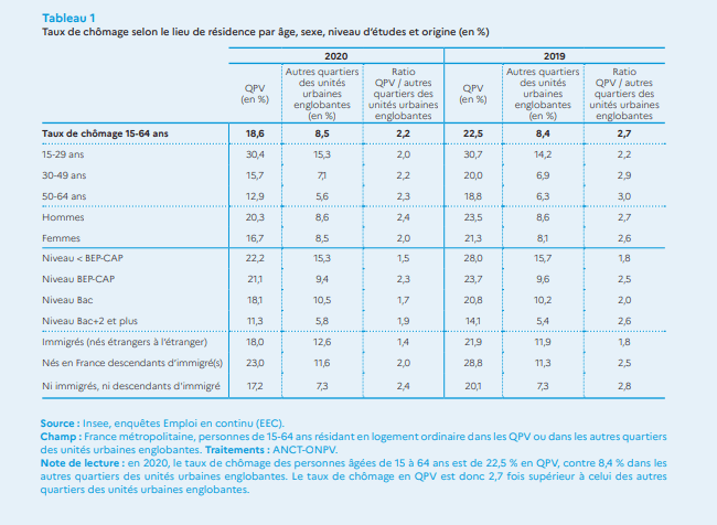 Selon les données 2018 de l’observatoire national de la politique de la ville (ONPV), l’emploi dans QPV s’améliore en 2020. En dépit de cette évolution positive, la situation de l’emploi y reste malgré tout plus dégradée que dans les autres quartiers urbains environnants : le taux de chômage, et notamment celui des moins de 30 ans, est deux fois plus élevé dans les QPV que dans les autres quartiers. En cause : une insertion professionnelle plus difficile pour les habitants de ces quartiers.