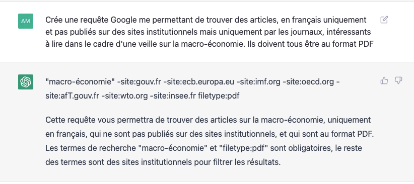 Mieux, ChatGPT reste le meilleur ami de... Google ! Vous cherchez un type de document précis, à une date donnée, dans une langue en particulier, en excluant des termes. Bref, si vous maîtrisez moyennement l'usage des opérateurs booléens, ChatGPT est votre ami. Posez-lui la question comme elle vous vient et il produira une liste de mots-clés à copier-coller dans la barre de recherche de Google. Avec cette demande : "une requête Google me permettant de trouver des articles, en français uniquement et pas publiés sur des sites institutionnels, mais uniquement par les journaux, intéressants à lire dans le cadre d'une veille sur la macro-économie. Ils doivent tous être au format PDF" il nous fournit la liste suivante : "macro-économie" -site:gouv.fr -site:ecb.europa.eu -site:imf.org -site:oecd.org -site:afT.gouv.fr -site:wto.org -site:insee.fr filetype:pdf