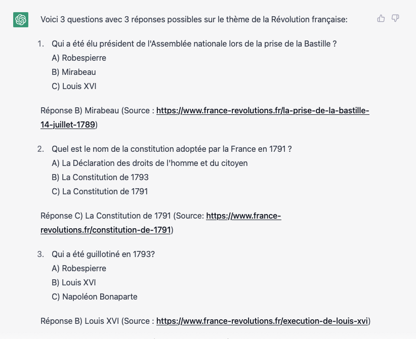 Nous avons écrit plus haut que ChatGPT ne citait pas ses sources. S'il demeure réticent à les fournir, vous pouvez néanmoins l'y forcer. Ainsi, avec cette formule, il vous livrera ce qu'il s'est passé en 1957, 1961, 1969, 1971 et 1986 : "Liste 5 dates clés de la conquête spatiale, en indiquant à chaque fois le nom de la source d’information sous forme de lien vers la page source". Ainsi, pour réviser des examens, il peut s'avérer très efficace. Là, il s'agira de lui demander de concevoir un QCM autour d'un thème. Exemple : "Fais un QCM sur le thème de la Révolution française. Je veux 3 questions avec à chaque fois 3 réponses possibles dont 1 seule est la bonne. Dans l’explication de chaque bonne réponse, cite la source d’information." Mais attention, ChatGPT sait mentir : à une des questions, il cite France-revolutions.fr... un site qui n'existe pas ! Alors méfiance, il faut alors le réinterroger en lui précisant que sa source n'est que pure invention afin de lui en demander d'autres. Pour le reste, il ne faut pas hésiter à exiger plus de questions à ajouter à ce QCM, car il ne connaît évidemment aucune limite à ce petit jeu. Tout comme il se montre précieux pour faire émerger des institutions, des personnalités, des chiffres dans un domaine précis. Avec les sites web utiles à consulter pour parfaire ses connaissances.