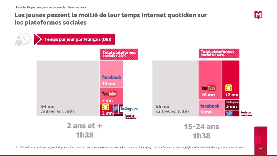 Si le 28 février pointe en particulier Facebook, chez les jeunes le réseau de Marc Zuckerberg tend à passer de mode. En 2017, le nombre d’utilisateurs de 12-17 ans aux USA aurait baissé de 9,9%, soit 1,4 million d’utilisateurs perdus. En ce qui concerne les utilisateurs de moins de 25 ans, Facebook aurait perdu 2,8 millions d’utilisateurs aux USA. En 2018, Facebook en perdra encore plus de 2 millions. La France suit aussi cette tendance puisque d’après Médiamétrie, chez les 15-24 ans, qui consacrent la moitié de leur temps aux médias sociaux, Youtube arrive en tête suivi de Snapchat. Facebook n’étant qu’en 3ème position.